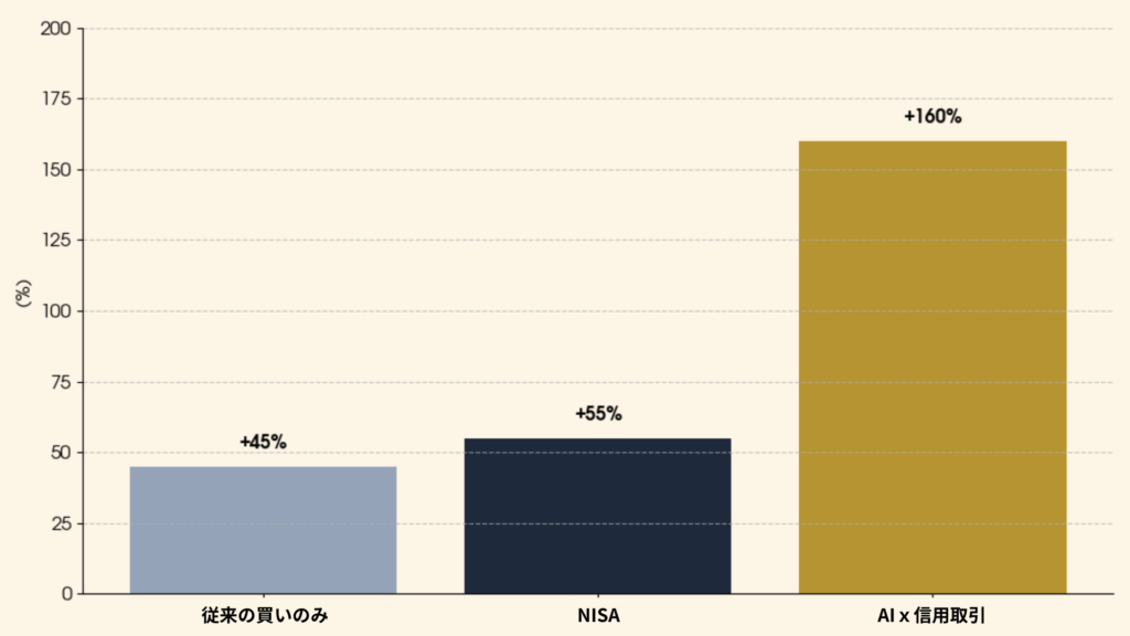 従来の投資法と比較して、AI×信用取引の組み合わせは圧倒的な成果を生み出します。上昇相場でも下落相場でも利益機会を見つけられるため、年間を通じて安定したリターンを実現できるのです。