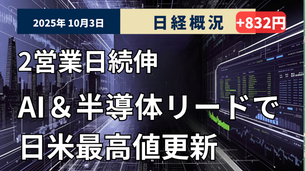 2025年10月3日の東京株式市場は大幅続伸しました。終値は前日比832円77銭(1.85%)高の4万5769円50銭で取引を終えました。約1週間ぶりに終値の史上最高値を更新しました。