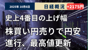 2025年10月14日の東京株式市場は大幅に続落しました。終値は前週末比1241円48銭(2.58%)安の4万6847円32銭で取引を終えました。