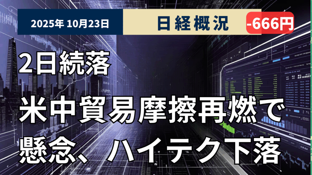 2025年10月23日の東京株式市場は続落しました。終値は前日比666円18銭(1.35%)安の4万8641円61銭で取引を終えました。前週からの「高市トレード」による急上昇の反動で利益確定売りも膨らみ、日経平均は一時900円超の下げ幅を記録しました
