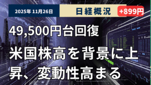 2025年11月25日の東京株式市場は小幅に反発しました。終値は前週末比33円64銭(0.07%)高の4万8659円52銭で取引を終えました。TOPIXは3,290.89(-6.84、-0.21%)、グロース市場指数は874.94(-13.92、-1.57%)で引けました。