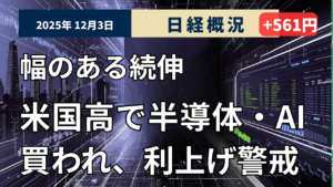 2025年12月4日の東京株式市場は3日続伸しました。終値は前日比1163円74銭(2.33%)高の5万1028円42銭で取引を終えました。 TOPIXも3,398.21と63.89ポイント高(+1.92%)で引け、広範な銘柄に買いが広がる強い値動きとなりました。 東証プライム指数も+1.92%高と、主力株中心に底堅さが確認されています。