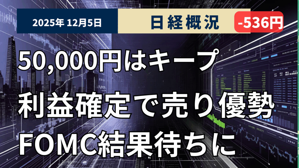 2025年12月5日の東京株式市場は4営業日ぶりに反落しました。終値は前日比536円55銭(1.05%)安の5万0491円87銭で取引を終えました。TOPIXは3362.56と35.65ポイント安(‐1.05%)で、大型株を中心に広く利益確定売りが出た格好です。 東証プライム市場指数も1.05%安の1731.75と、指数ベースでそろって1%超の調整となりました。