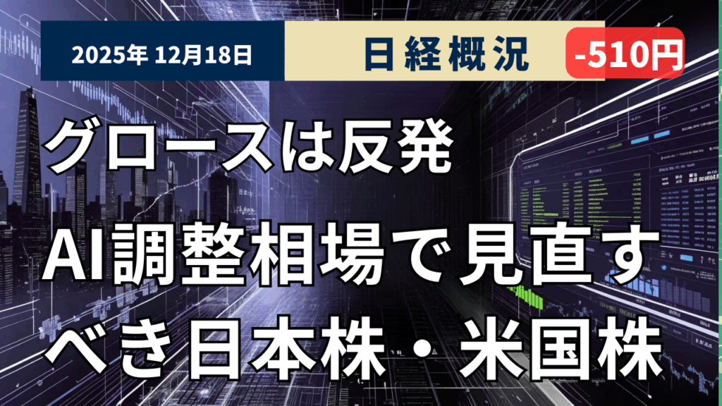 2025年12月18日の東京株式市場は反落しました。終値は前日比510円78銭(1.03%)安の4万9001円50銭で取引を終えました。TOPIXも3,356.89と前日比12.50ポイント安で終え、広範な銘柄に売りが広がる展開となっています。