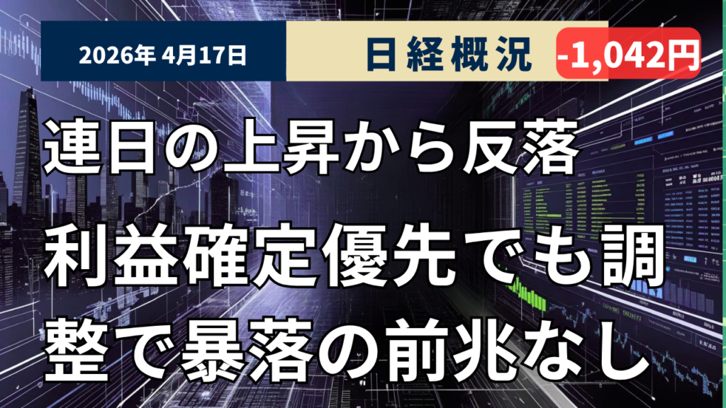 2026年4月17日の東京株式市場は4営業日ぶりに反しました。終値は前日比1042円44銭(1.75%)安の5万8475円90銭で取引を終えました。前日の急伸の反動と週末要因から広範囲に利益確定売りが出て、主要指数が揃って反落しました。