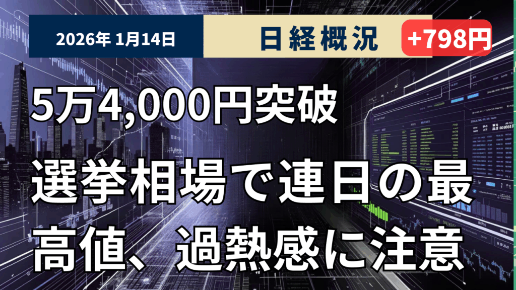 2026年1月14日の東京株式市場は3日続伸しました。終値は前日比792円07銭(1.48%)高の5万4341円23銭で取引を終えました。TOPIX は3,644.16(+45.27、+1.26%)、東証グロース市場指数は922.03(-7.68、-0.83%)となりました。