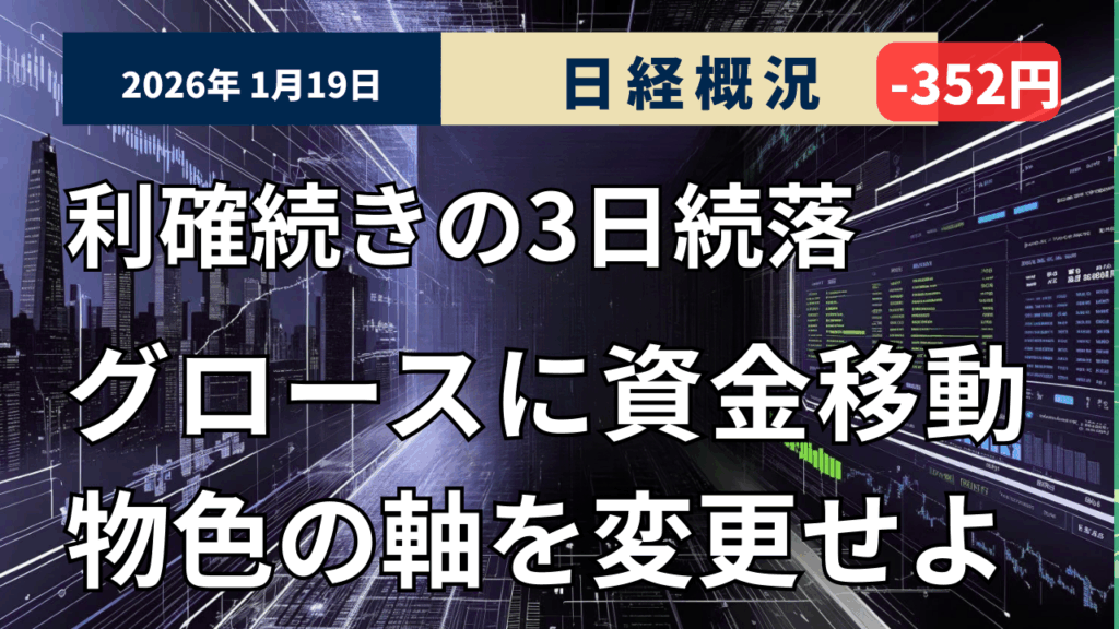 2026年1月19日の東京株式市場は3営業日続落しました。終値は前週末比352円60銭(0.65%)安の5万3583円57銭で取引を終えました。TOPIXの下げは小幅にとどまり、グロース市場は上昇するなど、主力株から中小型・成長株への物色シフトがみられます。