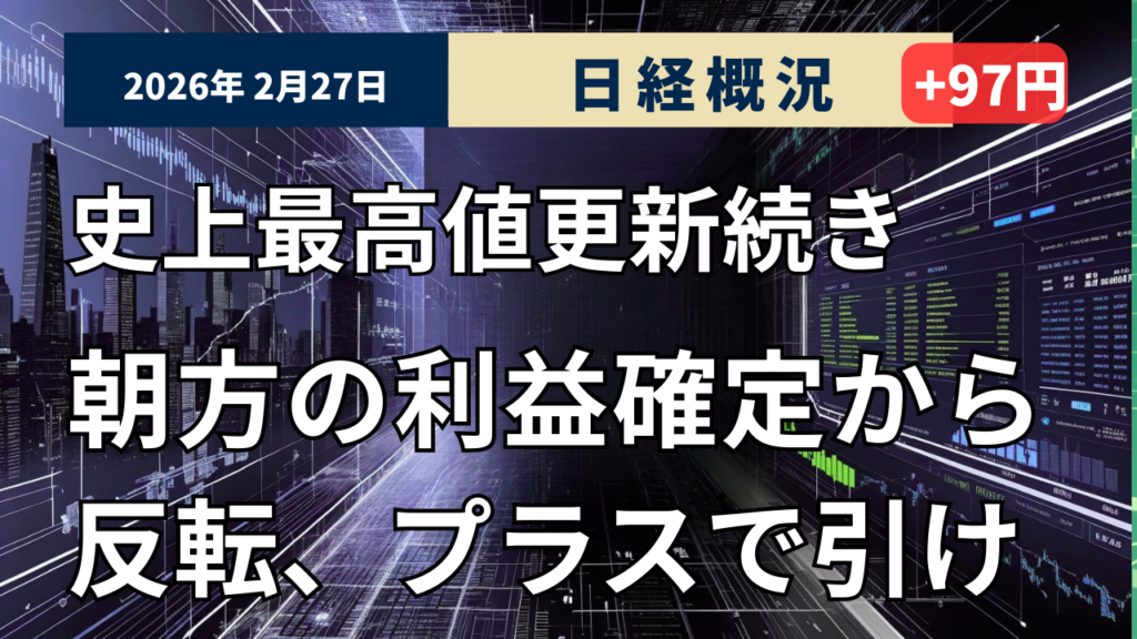 2026年2月27日の東京株式市場は4日続伸しました。終値は前日比96円88銭(0.16%)高の5万8850円27銭で取引を終えました。前日の米ハイテク株安を受け、日経平均は4日ぶりに反落して始まりましたが、下値では根強い買いが入りプラス圏に浮上しました