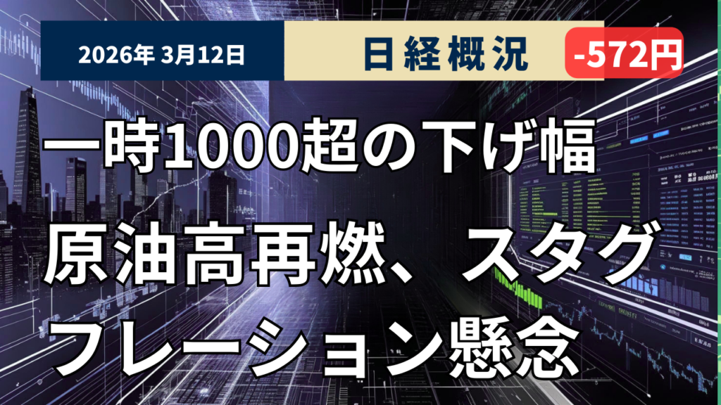 2026年3月12日の東京株式市場は反落しました。終値は前日比572円41銭(-1.04%)安の5万4452円96銭で取引を終えました。TOPIXは3,649.85と49.00ポイント安(1.32%安)、東証グロース市場指数も986.20と22.23ポイント安(2.20%安)と、新興株を含め広範囲に売りが出ています。