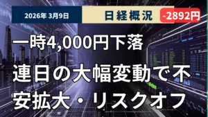 日本市場では、原油高と中東情勢の悪化懸念が一気に織り込まれ、先物主導で指数が短時間に大きく振れました。一方で、ドル円が158円台後半で踏みとどまり、本格的なリスクオフの円高には至っていない点は、日本株にとって一定の支えでもあります。直近の急落分の「半値戻し」が意識される中で、戻り局面では戻り売りと押し目買いの攻防が続く展開を想定したい局面です。