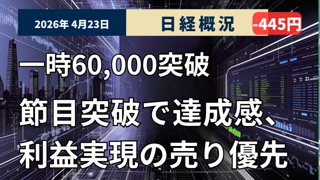 本日は、日経平均が初の6万円台を一瞬ながらも達成した後、達成感からの利益確定売りで反落したという「節目の相場」でした。AI・半導体関連に資金が集中しすぎた反動で、ハイベータ株の調整とディフェンシブ銘柄へのローテーションが同時進行した点が印象的です。