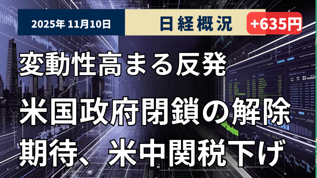 【市場の総括】 2025年11月10日の東京株式市場は反発しました。終値は前週末比635円39銭(1.26%)