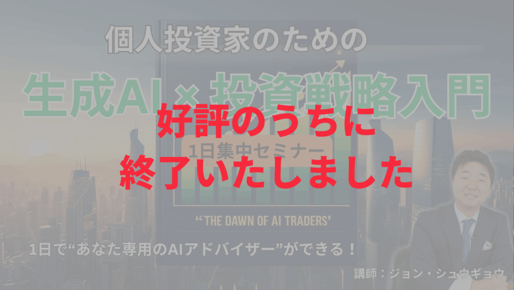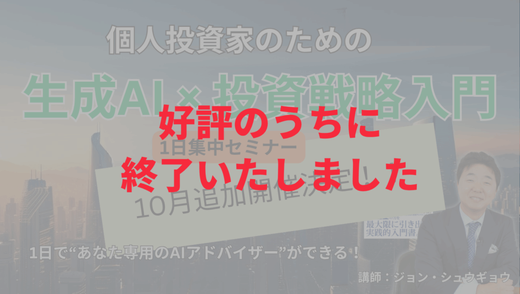 【10月追加開催!!】個人投資家のための生成AI×投資戦略入門|AIトレーダーの夜明け【1日集中セミナー+特典付き】 Read More »