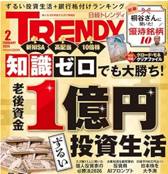 ホーム » 配信情報トップ » John's EVENT » 2026年1月5日:日経トレンディ2月号に登場します 2026年1月5日:日経トレンディ2月号に登場しますJohn's EVENT 書籍情報 日経トレンディ2月号インタビュー掲載! イベント概要 📅 発売日:2026年1月5日(月) 日経トレンディにてAIプロンプトを活用した投資術を語ります。 購入はこちら 関連投稿 【2025年版】書店員が選ぶ!初心者におすすめの株・投資本 30選に選ばれました 2025年12月6日:「沖縄ジュンク堂書店」のトークイベントに登壇 2026年2月13日:日本経営合理化協会に登壇